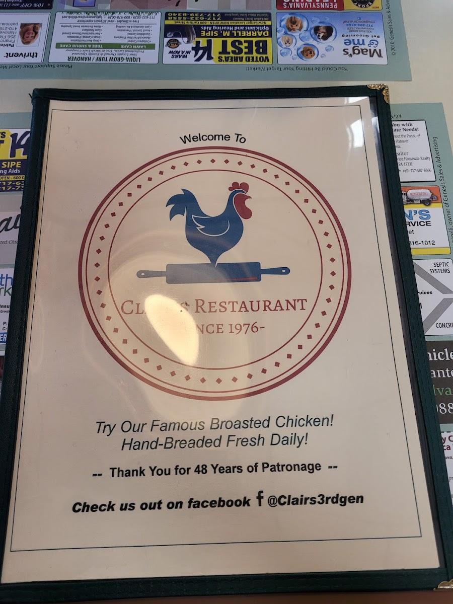 Clair's is a hidden gem outside of Hanover, PA for decades. Nothing fancy but delicious homemade comfort food and delicious desserts. Reasonably priced and loved by locals and those from a far. You know a good restaurant when you walk in and the place is filled with SMILING senior citizens!